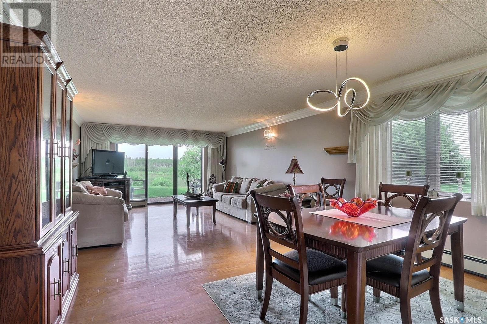 Winter Sale, Immediate Possession! Prime location meets prime unit in this 2 bedroom, 2 bathroom main floor condo in the Riviera building. Enjoy stunning views of the North Saskatchewan River and green space from the open concept living and dining area with gleaming hardwood floors. The u-shaped white kitchen offers pass-through counter and seamless views of the living space. Step out onto the covered patio with direct access to the green space. Both bedrooms are spacious, with the primary featuring a 2-piece ensuite. Additional highlights include a large foyer with closet, in-suite laundry, elevator access, lounge amenities, single garage parking spot, and wheelchair accessibility. (id:4069)