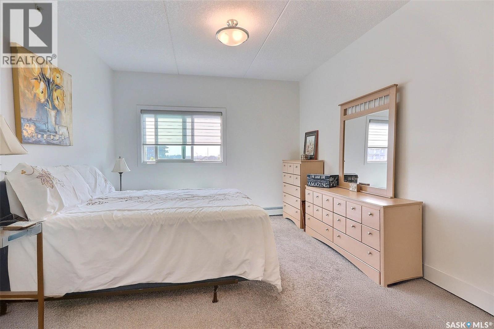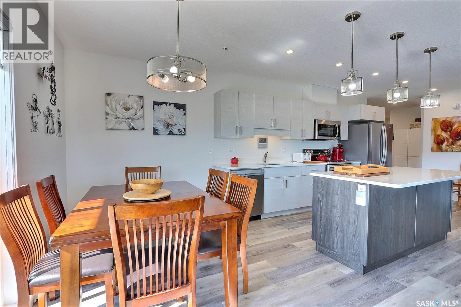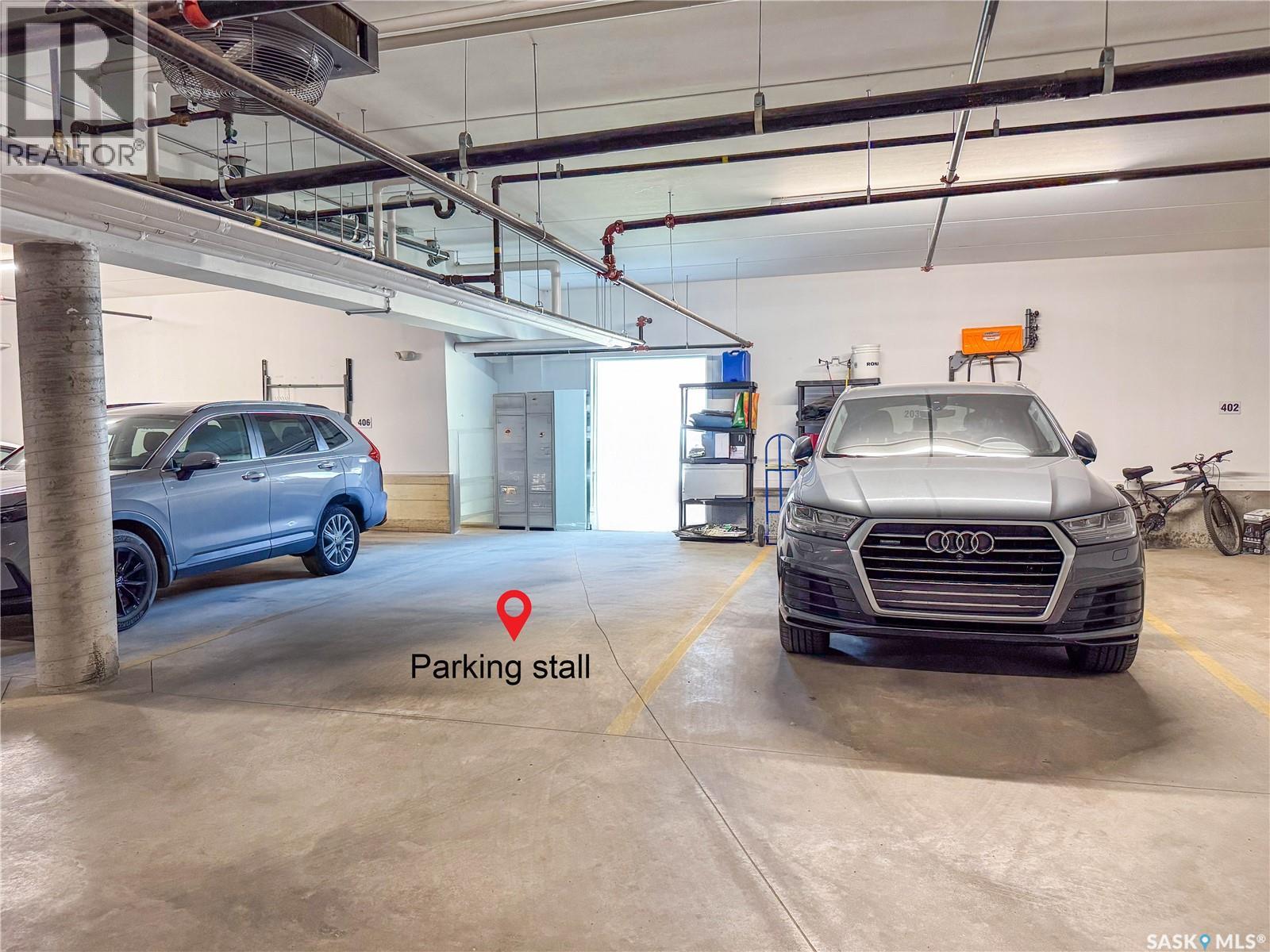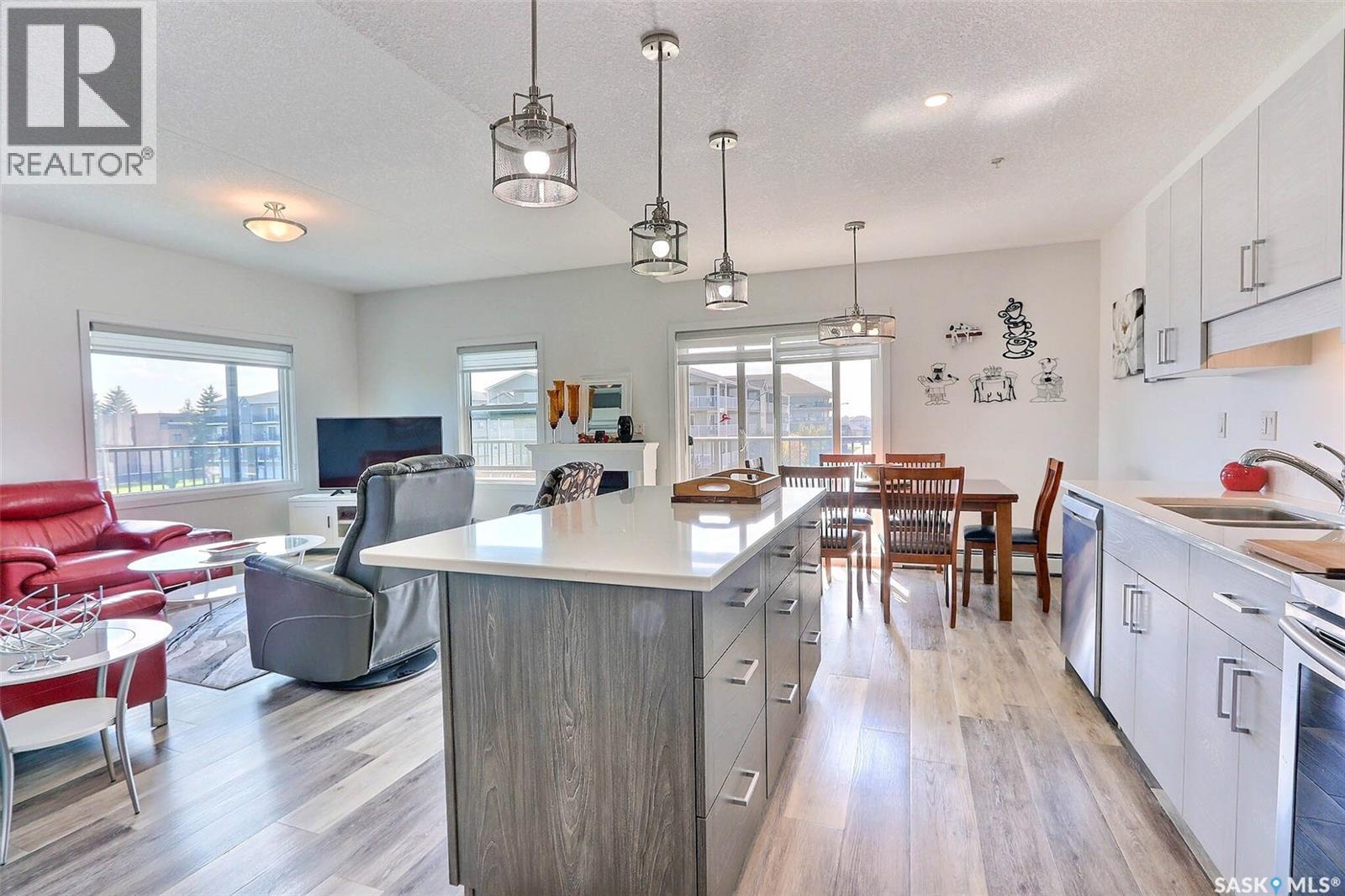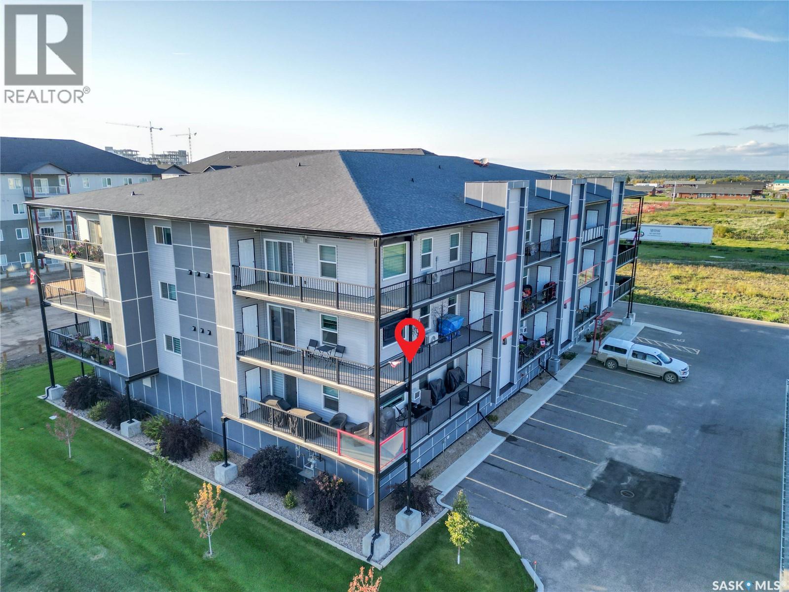 Stunning 2 bedroom, 2 bathroom condo offering 1,174 sq ft of luxury and low-maintenance living. This open-concept home features vinyl plank flooring and quartz countertops throughout, a bright white kitchen with stainless steel appliances, a 6’ island, and expansive windows that flood the space with natural light. Soaring 9’ ceilings enhance the spacious feel, while the southeast-facing covered wrap-around balcony includes two electrified and insulated storage rooms plus a natural gas BBQ line. The primary suite boasts its own bathroom, and the in-suite laundry provides additional storage space for convenience. Building amenities include an elevator, heated parking garage space, workshop, common room with a kitchenette, and an exercise area. Ideally located near the Alfred Jenkins Field House, hospital, and many other amenities, this condo combines elegance, comfort, and ease of living. (id:4069)