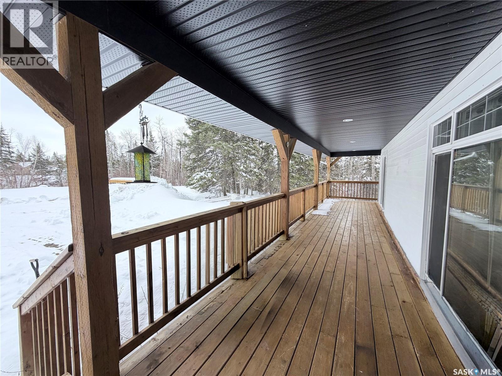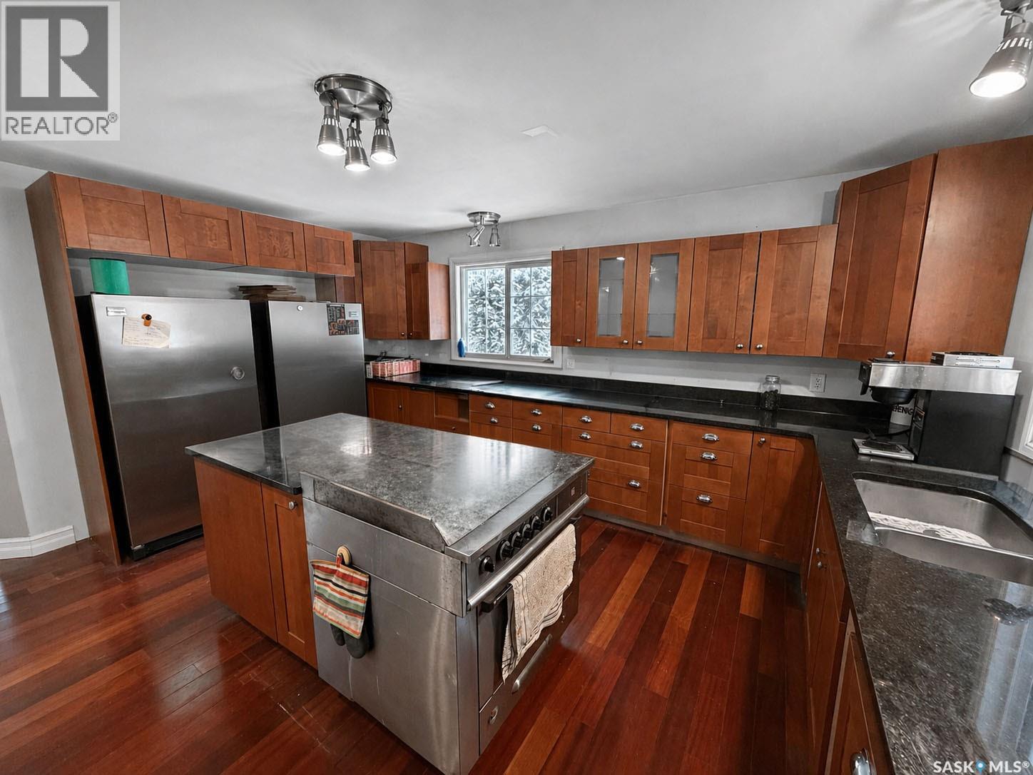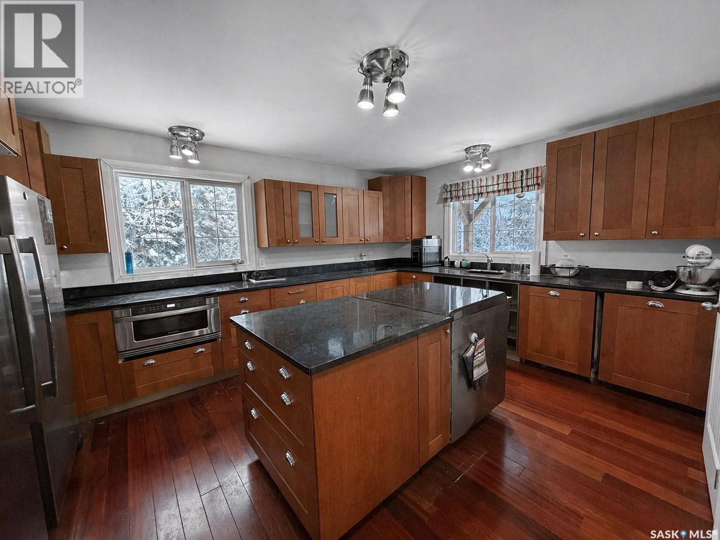 Tucked among mature trees for year-round privacy, this beautiful 1,920 sq/ft raised bungalow offers the perfect blend of comfort and convenience just minutes from Emma Lake’s main attractions. Built in 2009, this home features 3 bedrooms plus a den and 3 bathrooms, making it ideal for families or those who love to entertain. A large covered front porch welcomes you inside to a bright and spacious main floor with hardwood throughout. The inviting family room is filled with natural light from oversized windows and flows seamlessly into the sizeable U-shaped kitchen, complete with an abundance of cabinetry, ample counter space, an island, and stainless steel appliances. The adjoining dining area offers patio door access to a generous deck overlooking the beautifully treed yard, perfect for outdoor gatherings. The primary bedroom is a relaxing retreat with plenty of natural light, a walk-in closet, and a 4-piece ensuite. Two additional bedrooms, a large den, and a second 4-piece bathroom provide plenty of space for family or guests. A convenient 2-piece bathroom and main floor laundry add to the home’s functionality. The basement is open and ready for your personal finishing touches, featuring large windows that offer great potential for additional living space. Enjoy peaceful acreage living with the added benefit of being just minutes from Emma Lake, offering recreation, amenities, and year-round enjoyment. (id:4069)